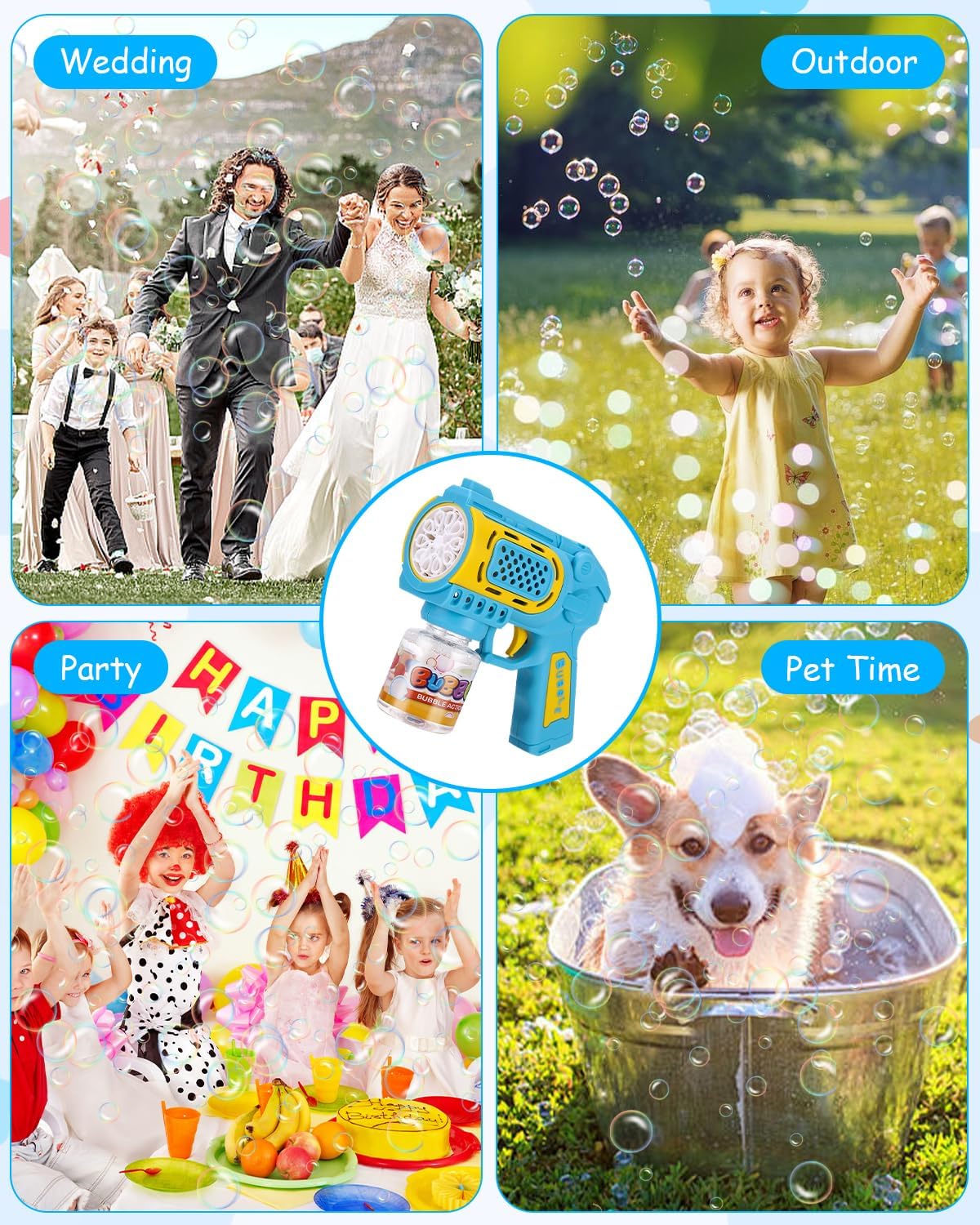 ✨ Fácil de usar: Funciona con 4 pilas AA (no incluidas). Simplemente presiona el gatillo y observa cómo salen las burbujas de 10 orificios sin necesidad de soplar manualmente.