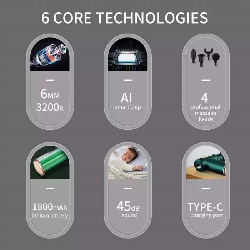 Con 4 velocidades ajustables, alcanza hasta 3200 rpm y una amplitud de vibración de 6 mm, penetrando profundamente en los músculos para romper nudos, aliviar tensión y tratar grupos musculares difíciles de alcanzar.